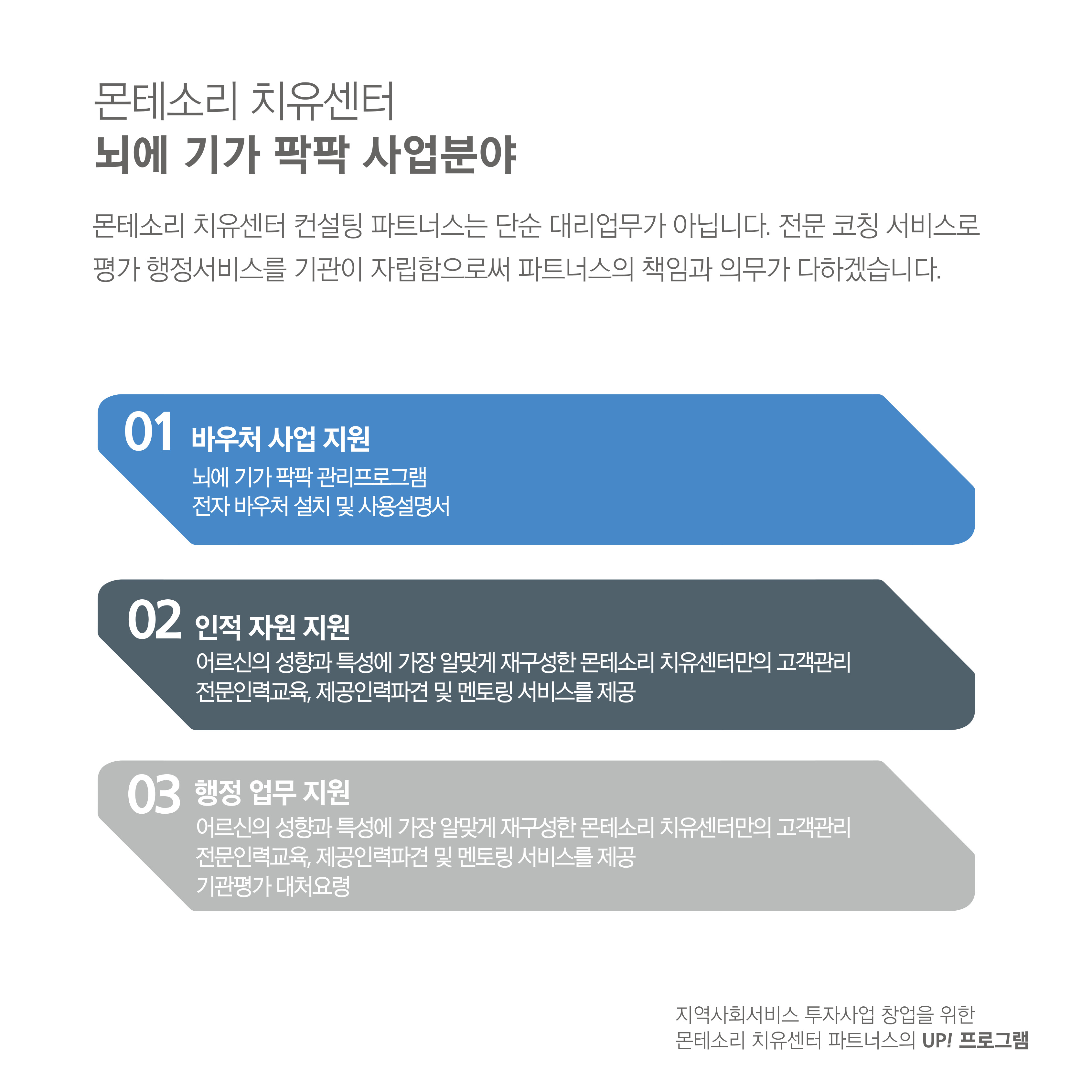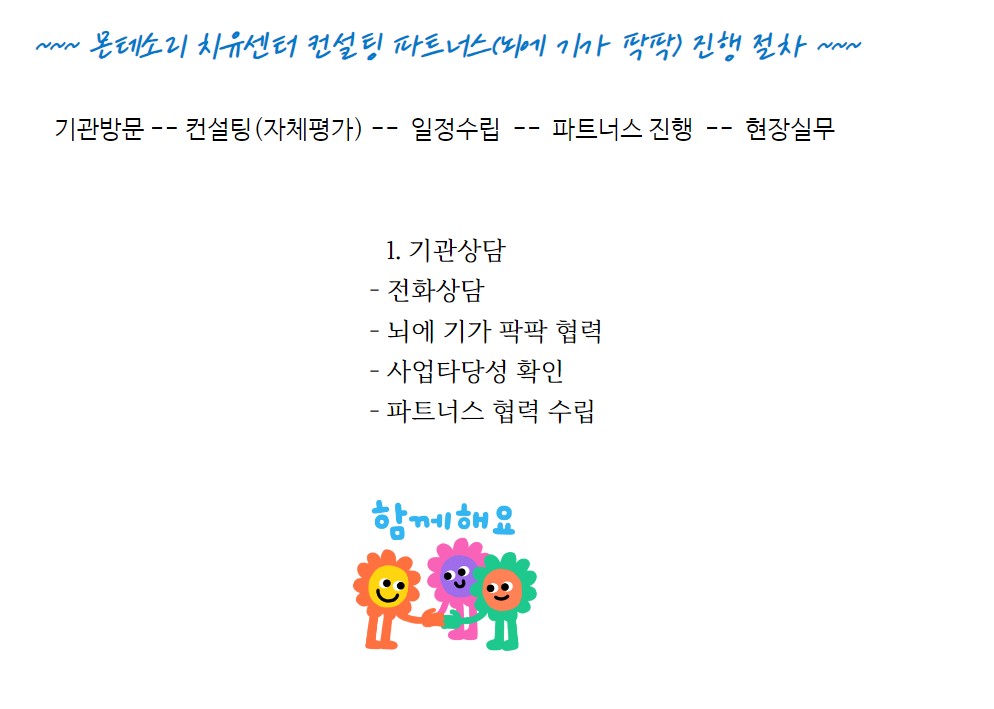 컨설팅 파트너스 뇌에 기가 팍팍 컨설팅 파트너스(몬테소리 치유센터) kkkk1377 2024. 7. 23. 01:52 반응형 몬테소리치유센터는-코람대오의 바탕으로 호스피스돌봄, 치매예방(뇌에기가 팍팍)등을 전문으로 하는 전문센터입니다. 뇌에 기가 팍팍 컨설팅 파트너스(몬테소리 치유센터) 상담문의 : 010-9868-2103 반응형 공유하기 게시글 관리 몬테소리 치유 센터 저작자표시 비영리 변경금지 (새창열림)